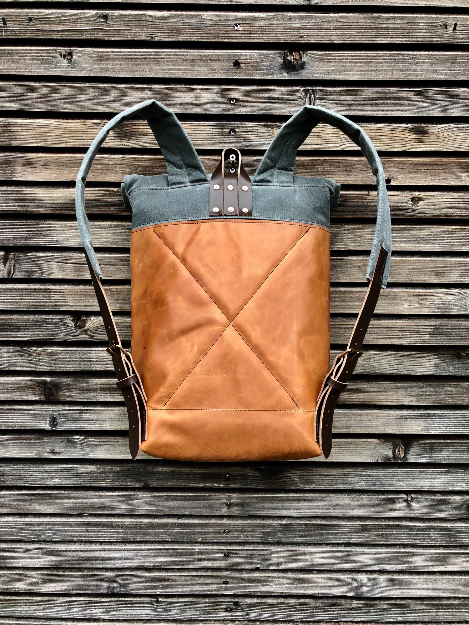 This bag is constructed from heavy weight waxed canvas in the color grey combined with cognac color oiled leather, and dark brown vegetable tanned leather for , buckle and straps.