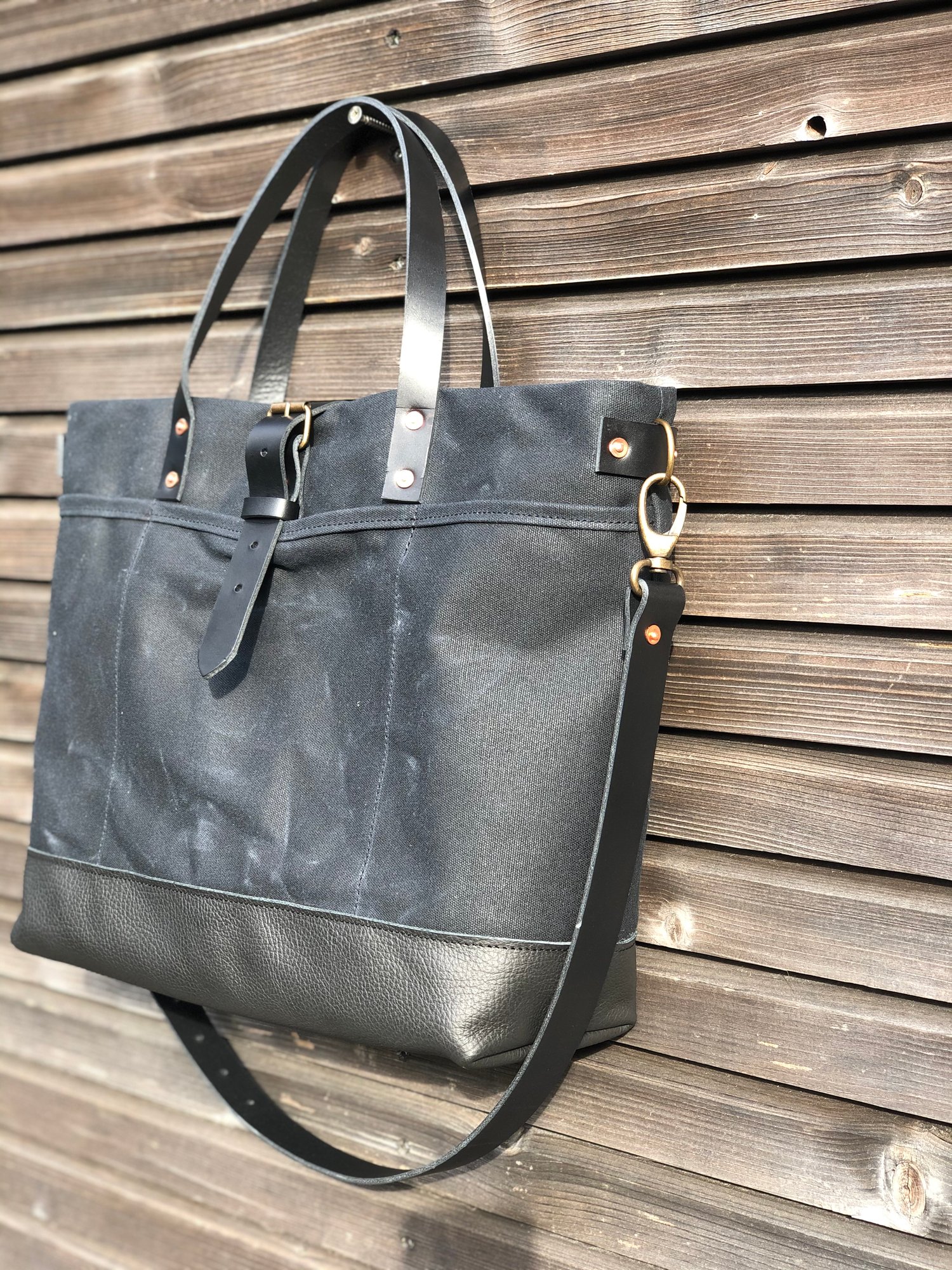 Black tote bag in waxed canvas with leather bottom and cross body strap