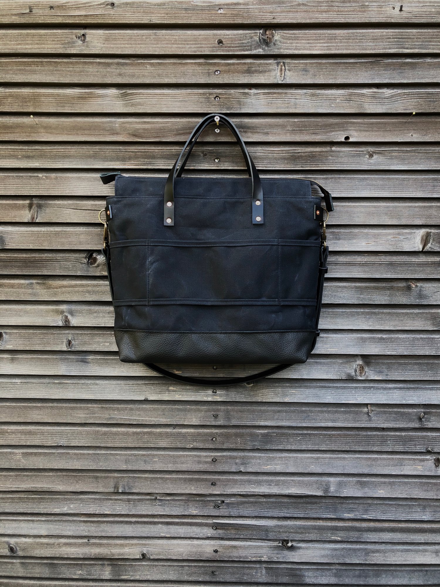 Black waxed canvas tote bag / office bag with luggage handle attachment leather handles and shoulder