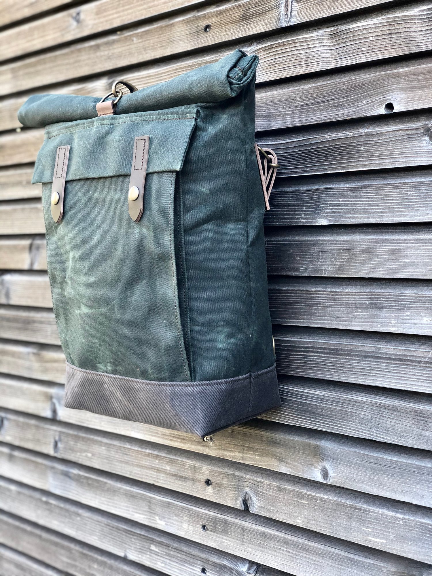 Constructed in heavy weight waxed canvas in forest green for the corpus and double layer for the bottom in grey brown waxed filter twill.