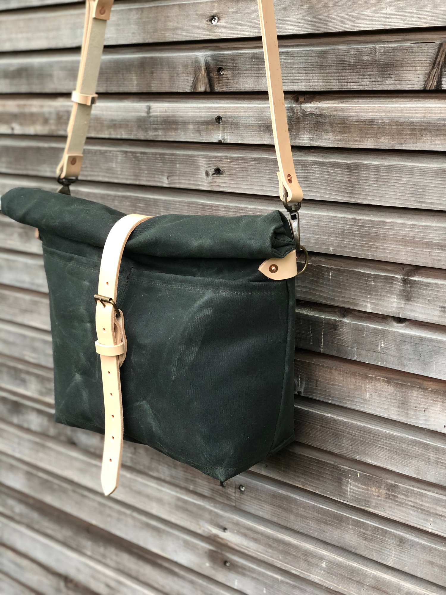 Forest green waxed canvas messenger bag / cross body bag with double waxed canvas padded bottom COLL