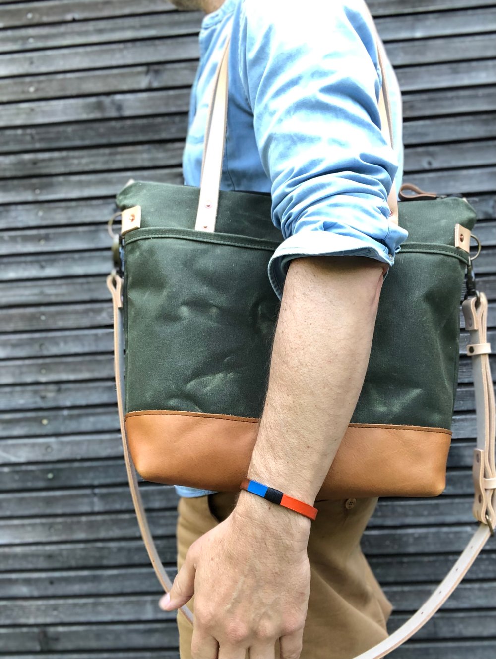Olive green waxed canvas tote bag / office bag with leather handles and shoulder strap