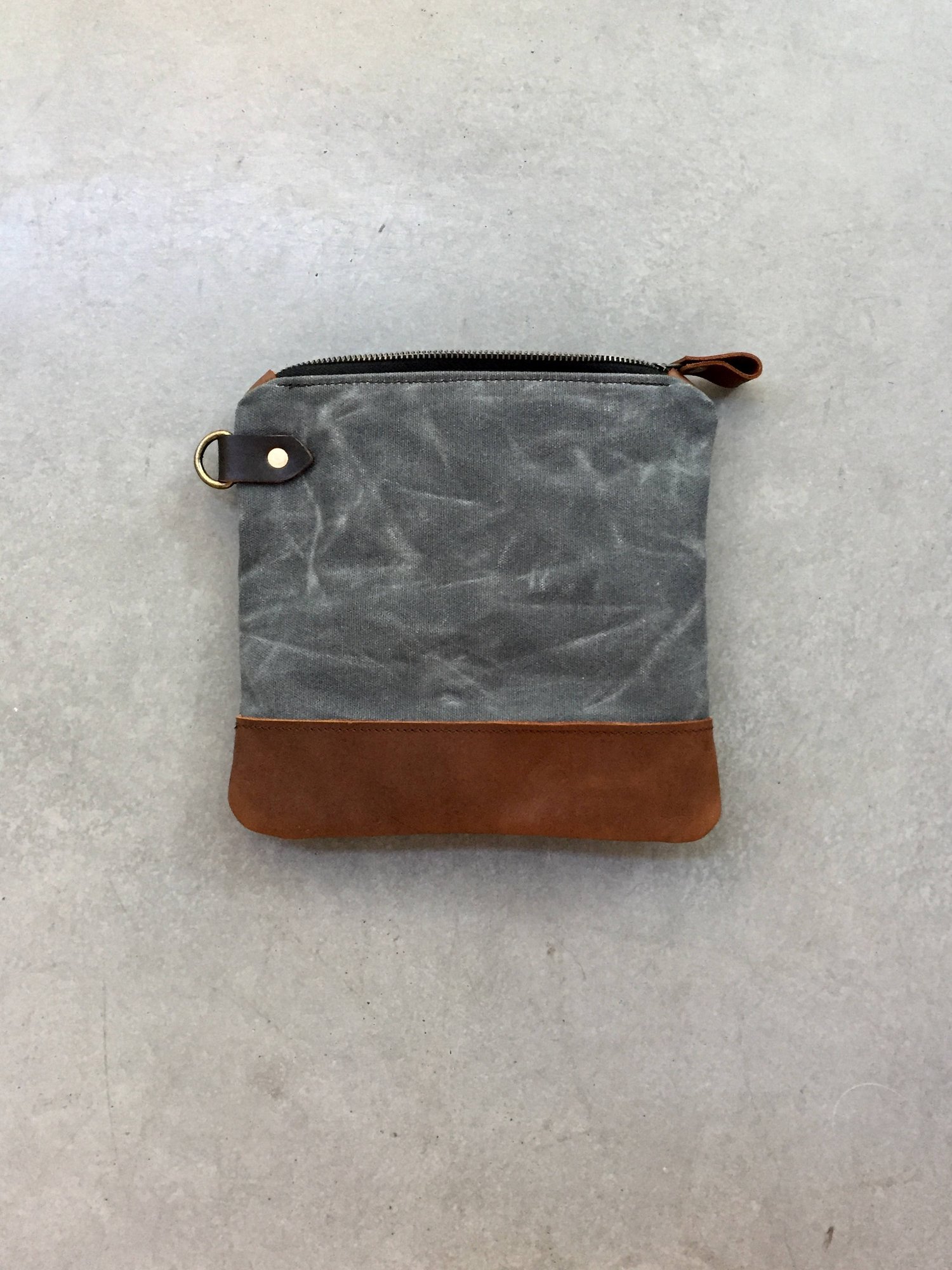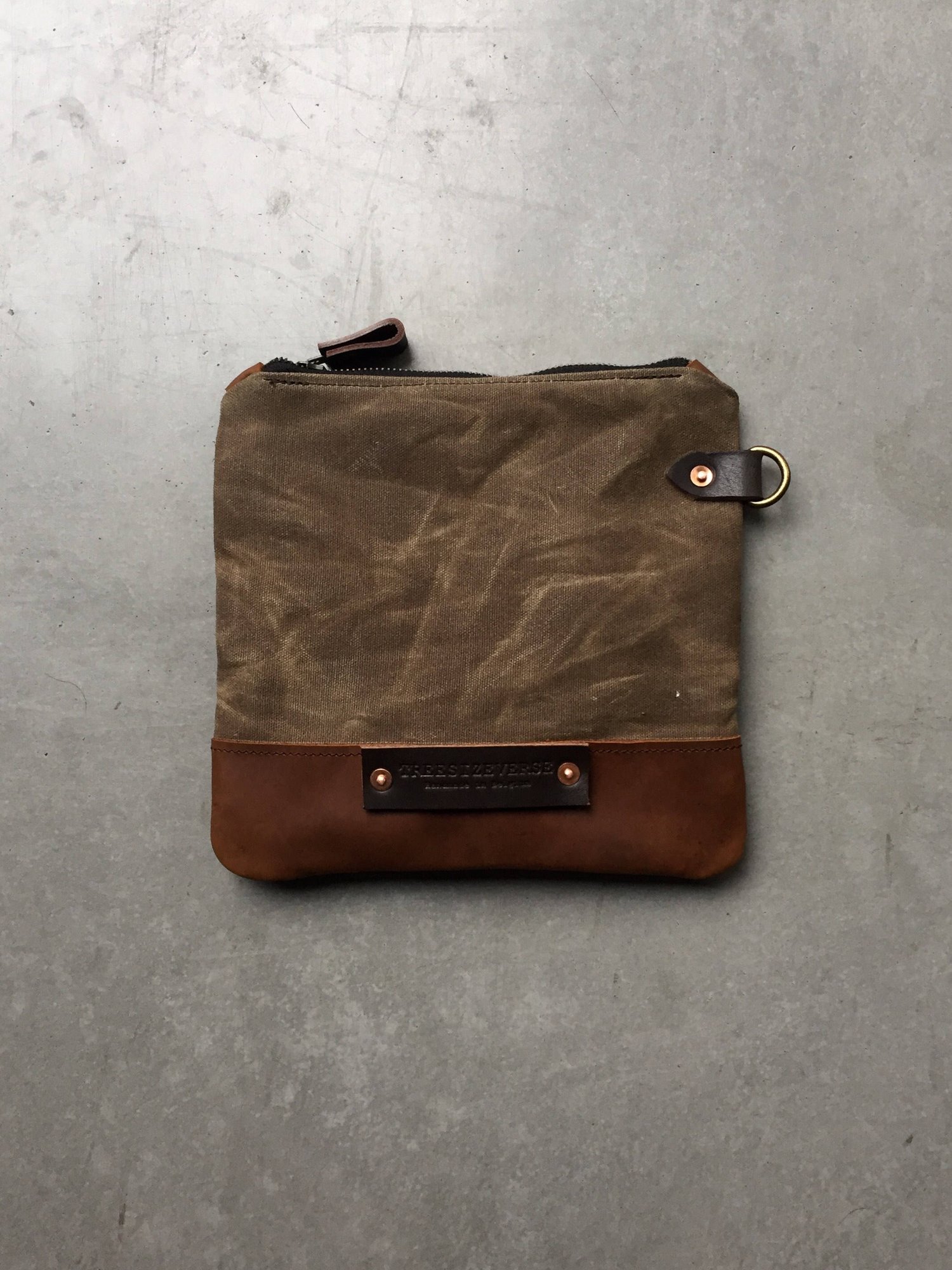 This pouch is made in waxed canvas with a bottom in oiled leather.