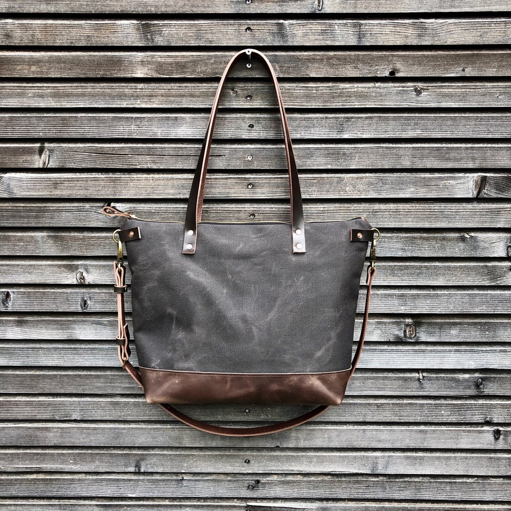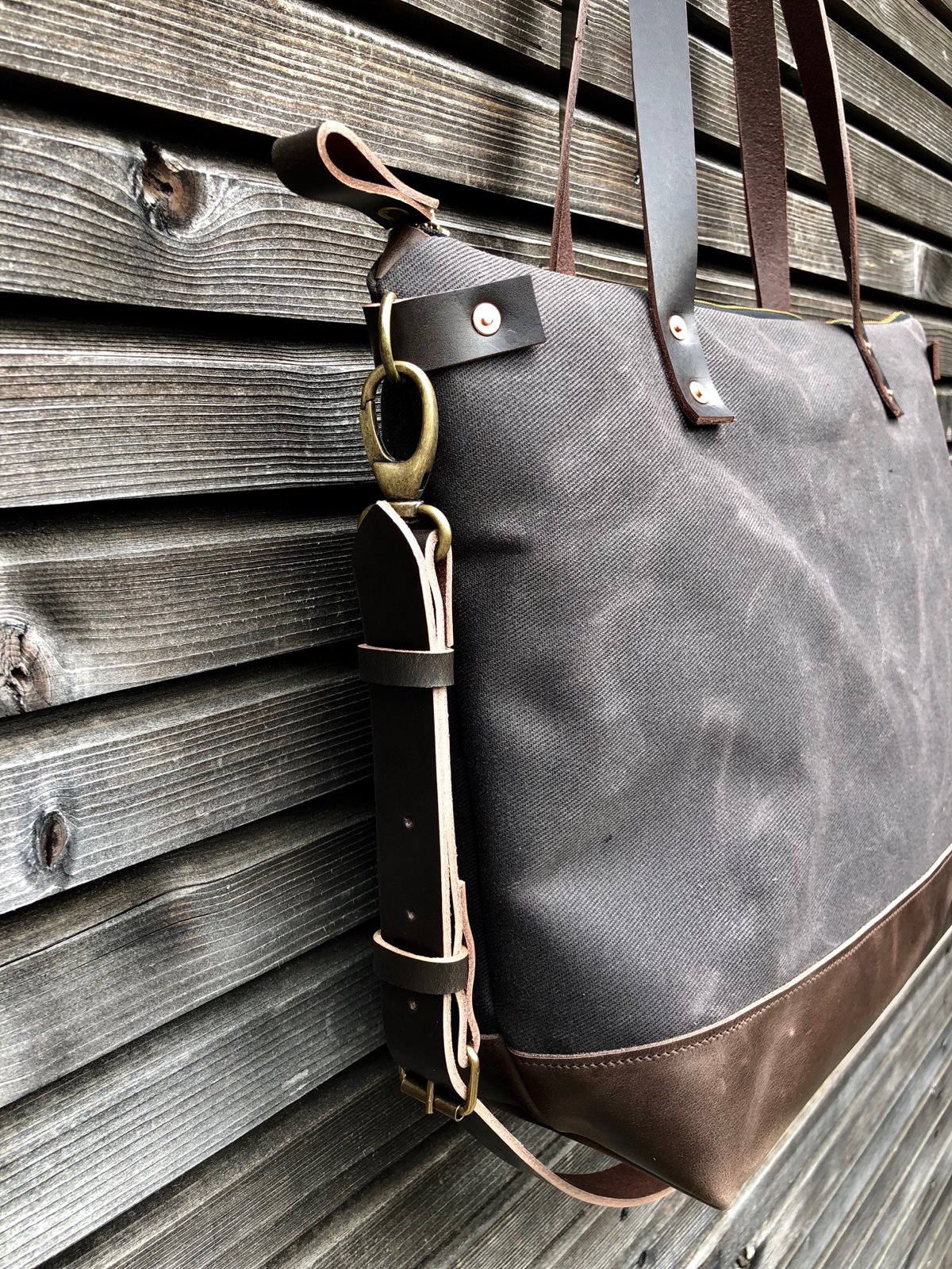 Tote bag made in American heavy weight waxed filter twill . The color is grey brown with leather bottom.