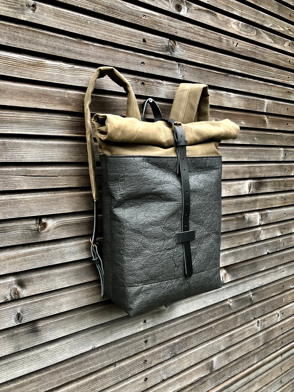 Vegan backpack in black Piñatex™ and field tan waxed canvas with roll to close top