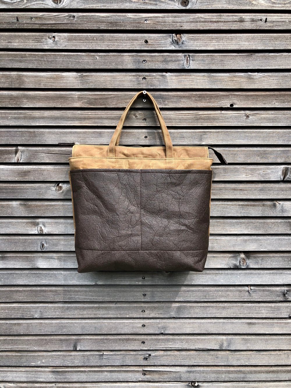 Vegan large tote bag in brown Piñatex™ and waxed canvas office tote laptop tote bag
