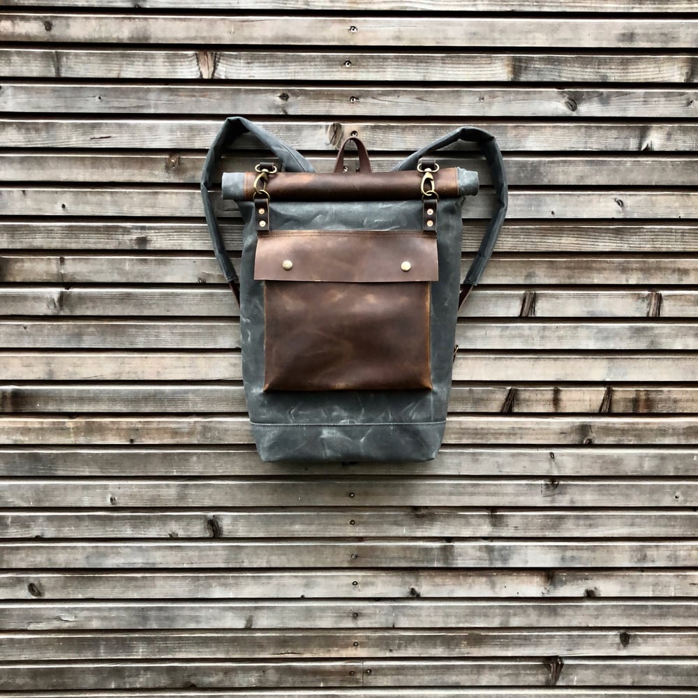 This backpack is made from heavy weight waxed canvas in the color grey with an outside pocket made in brown waxed leather, the leather is also used in the roll to close top.