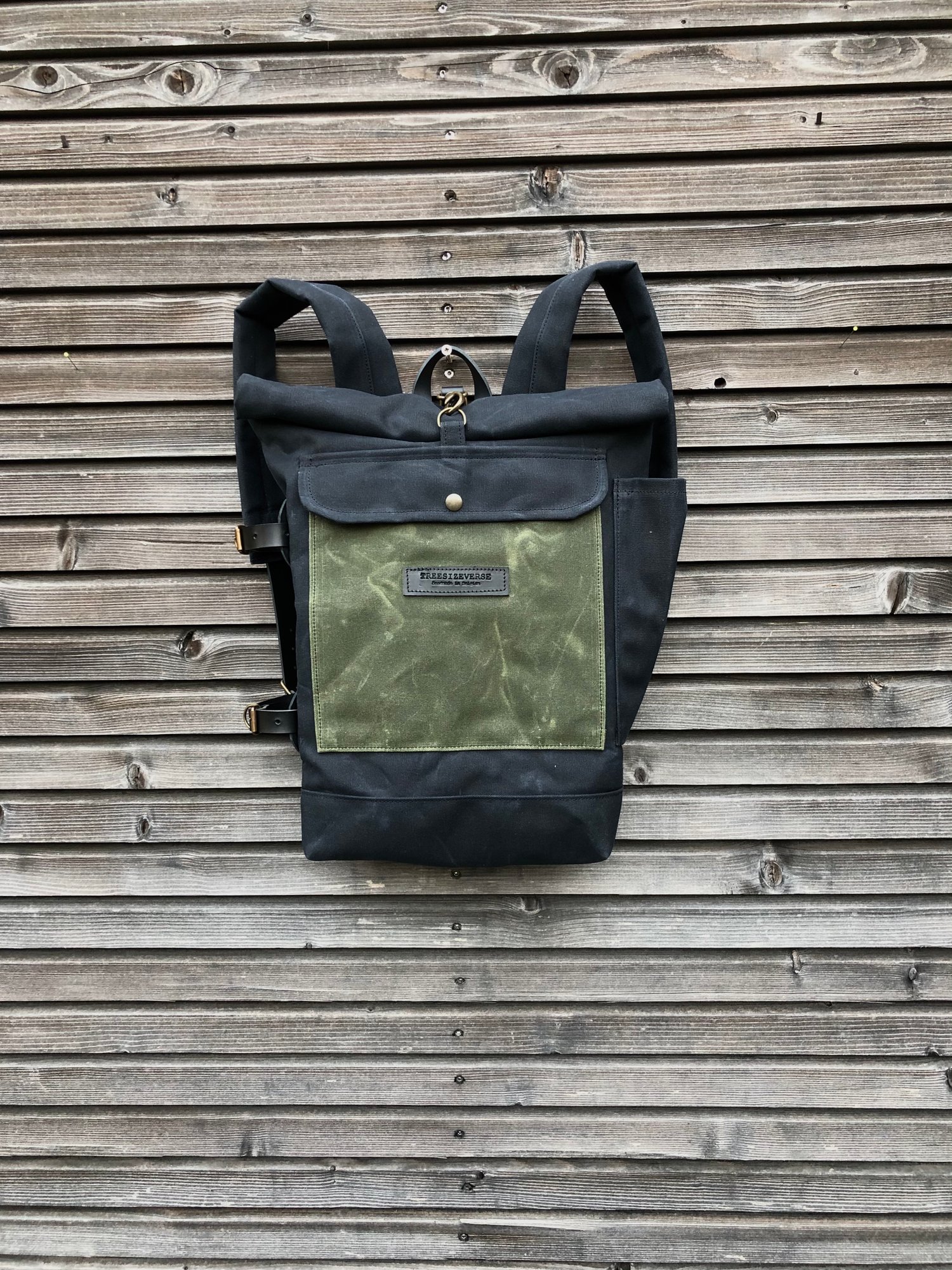 This pack is constructed out of a Heavy weight waxed canvas for the body in black , with a double layer for the bottom and padded shoulder straps. De outside pocket is made in olive green waxed canvas