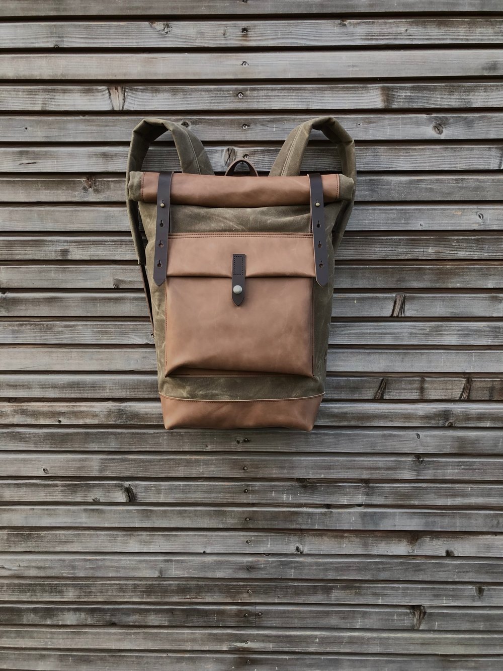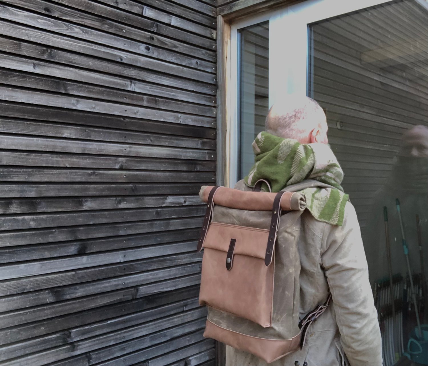 Waxed canvas backpack with roll up top and oiled leather bottem in dark taupe