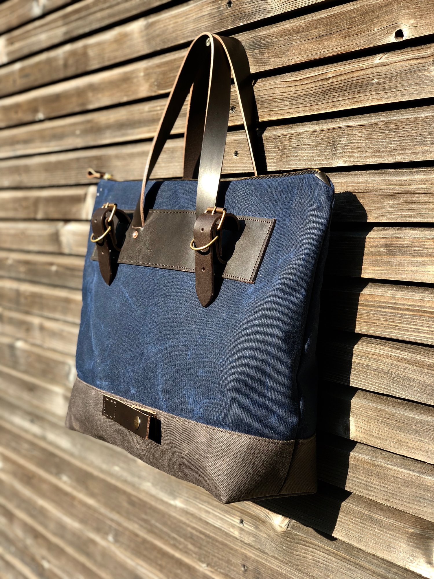 The bag is made in waxed canvas navy blue for the body and grey brown for the bottom. And attaches to the bike with a double leather strap and buckle. Padding on the bottom.