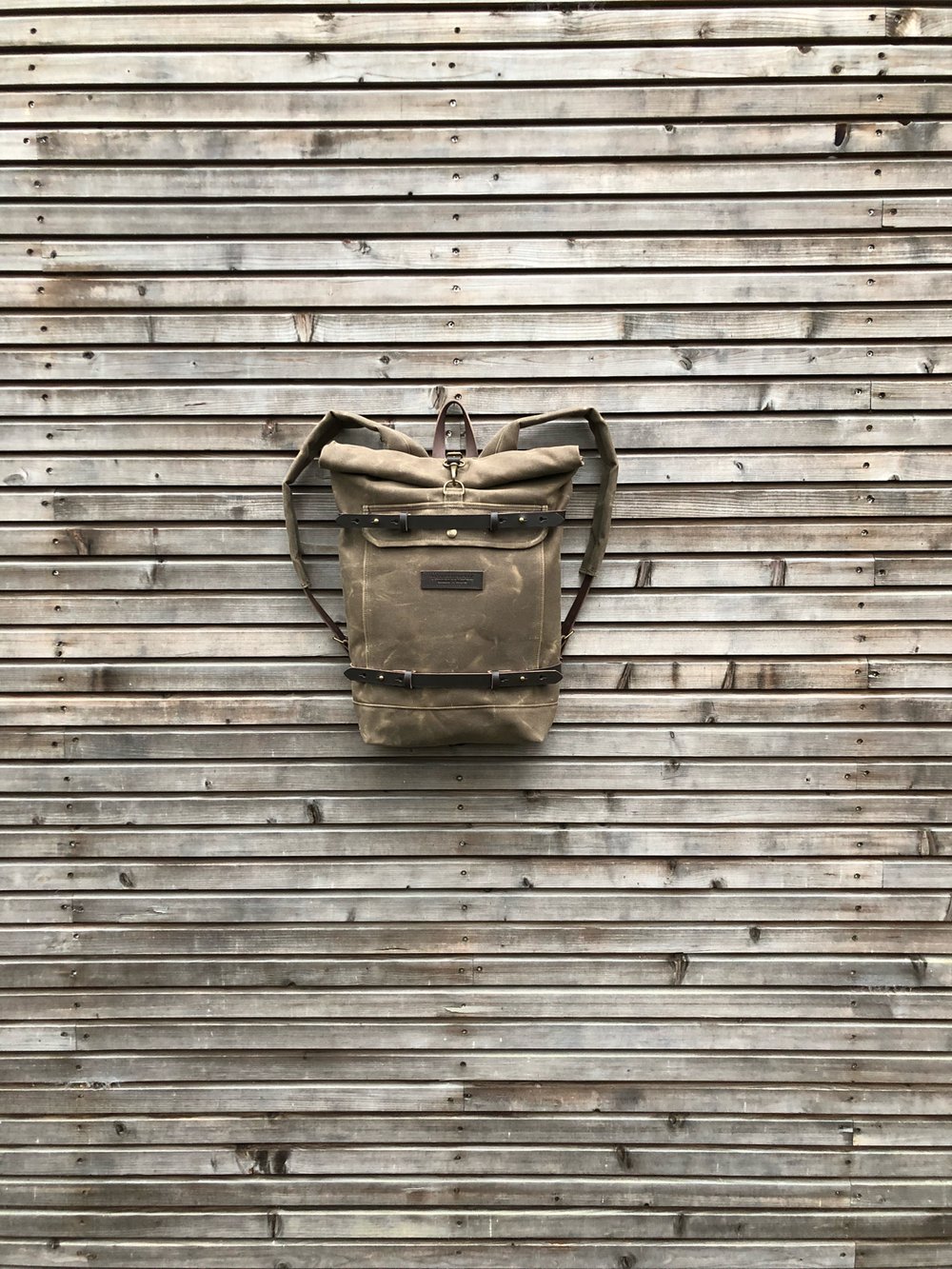 Waxed canvas backpack - rucksack with folded top and waxed canvas padded shoulder straps