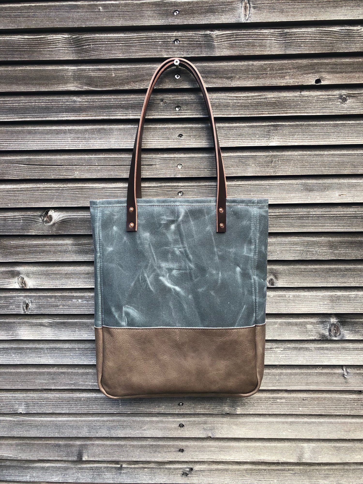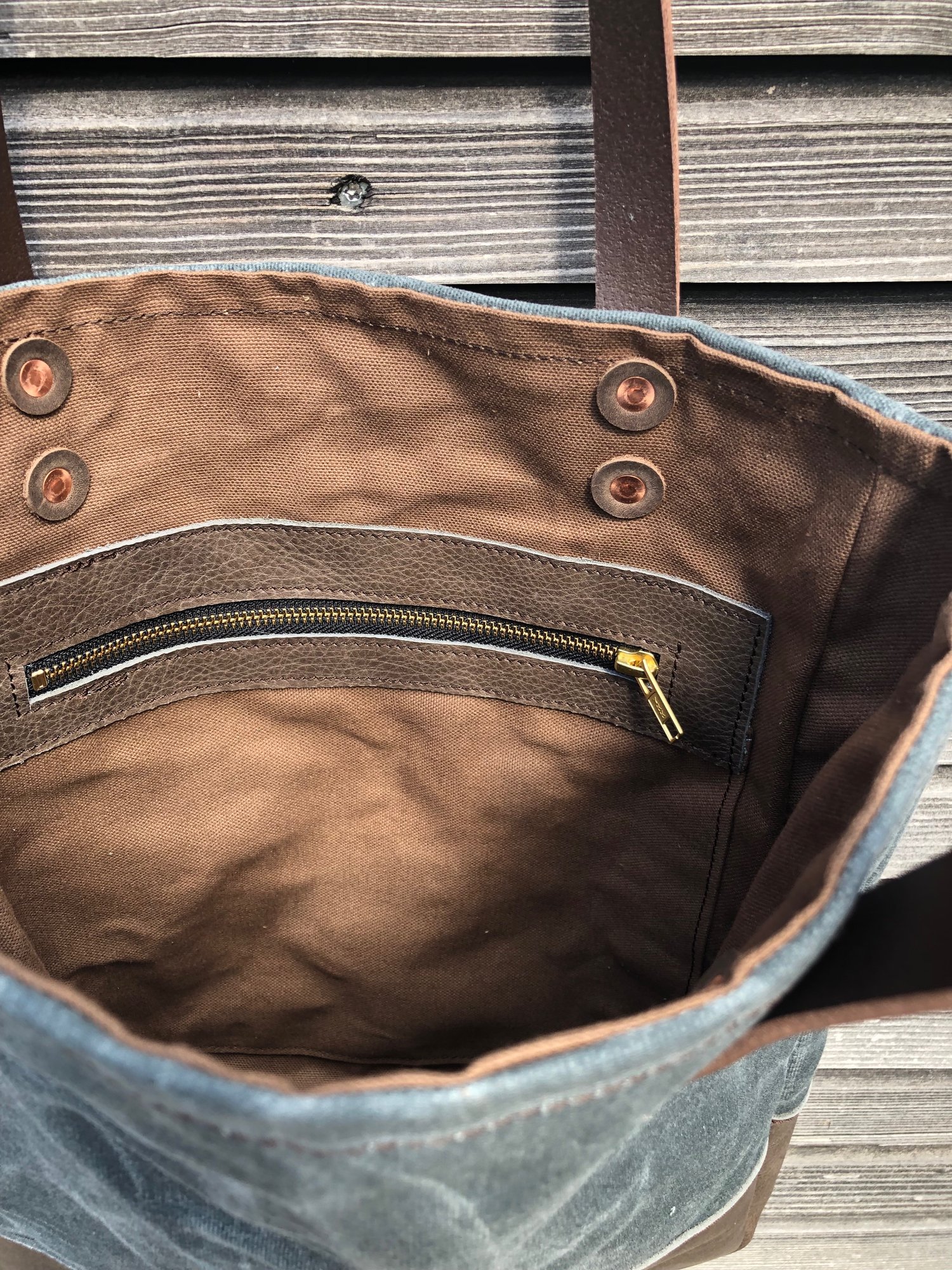 Tote bag made in American heavy weight waxed canvas. The color is slate for the body and base in driftwood grey oiled leather.