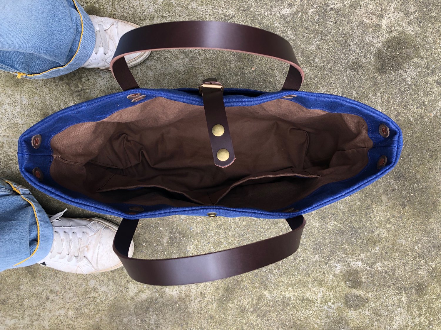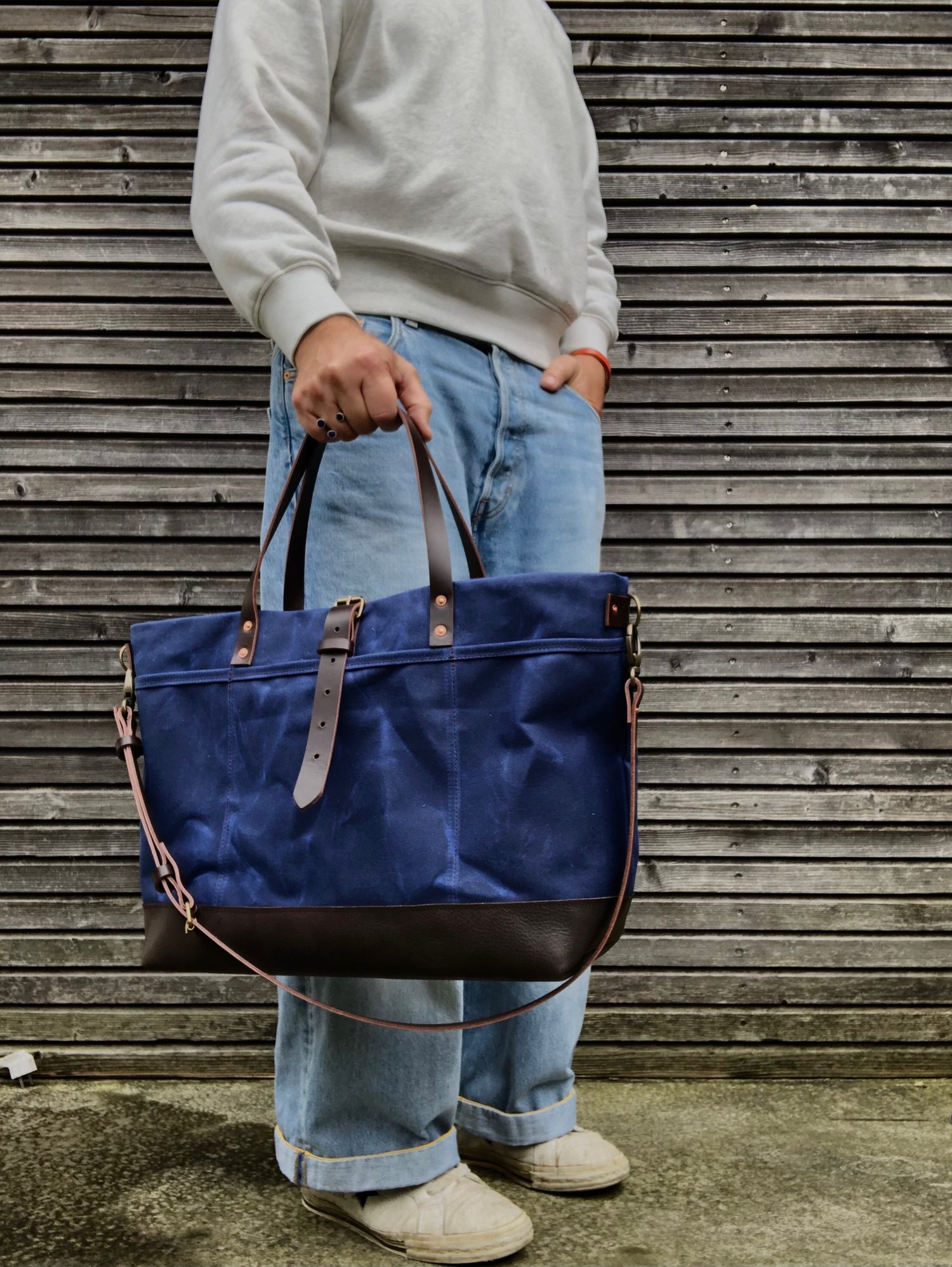 XL bag in navy blue waxed canvas and dark brown oiled leather base